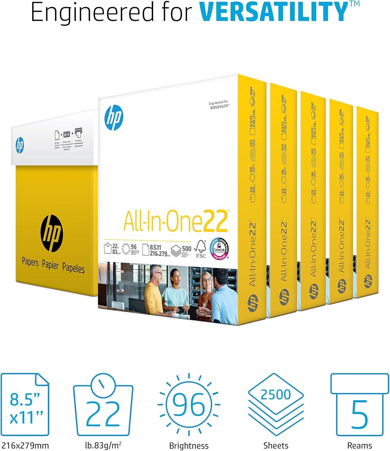 HP Papers is a premium line of uncoated printing paper optimized to provide superior print paper performance when used with HP hardware and supplies and in all other makes and models of printing and copying equipment. Launched in 1996, HP Papers are manufactured and marketed exclusively worldwide in over 75 countries by Sylvamo, a globally recognized leader in paper products, under license from the Hewlett-Packard Company. With a diverse range of products designed to support a wide range of print applications, from everyday copies to full-color presentations, you can be assured of consistent, high-quality print performance every time. HP All-In-One22 Paper is a 22 lb, super smooth paper that is thicker, brighter and whiter than ordinary multipurpose paper. HP All-In-One22 is perfect for everyday printing with some color and great for double-sided printing. Its ultra white shade and ColorLok Technology provide brighter colors and bolder blacks for reports, school work and professional-looking business documents. HP All-In-One22 is optimized for use in all inkjet and laser printers and copiers. HP All-In-One22 printer paper is available in 8. 5 x 11 letter size paper.